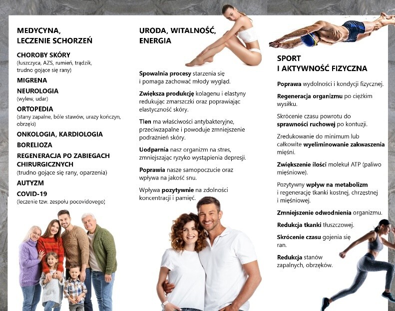 Tlenoterapia wspiera leczenie: łuszczyca, trądzik, egzema, atopowe zapalenie skóry, trudno gojące się rany, stany zapalne, owrzodzenia, reakcje alergiczne i wysypki.